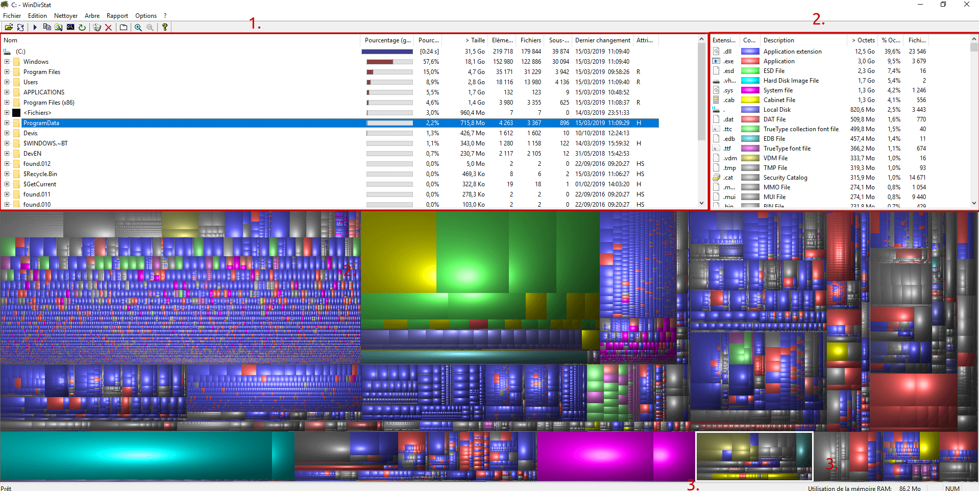 Dans l’encadré n°1 se trouve la liste des fichiers, classés par leurs poids du plus lourd au plus léger. De nombreuses autres statistiques sont associées à chaque ligne (nombre de fichiers, nombre de sous-répertoires, pourcentage de place occupée, etc.).