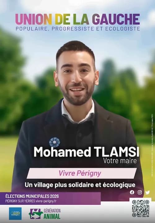 « Je suis Mohamed-Lamine Tlamsi, j’ai 30 ans et je suis candidat à l’élection municipale de Périgny-sur-Yerres (Val-de-Marne) sous l’étiquette Europe Égalité Écologie (centriste). Étudiant en droit et aide à domicile auprès des personnes âgées, je suis profondément attaché à la justice sociale et à l’égalité et la dignité de chacun », énonce l’intéressé très doctement, en détachant chaque syllabe, comme au ralenti. Ce ton assez étonnant s’explique aisément : le candidat ne s’exprime pas directement, mais au travers de son affiche parlante.